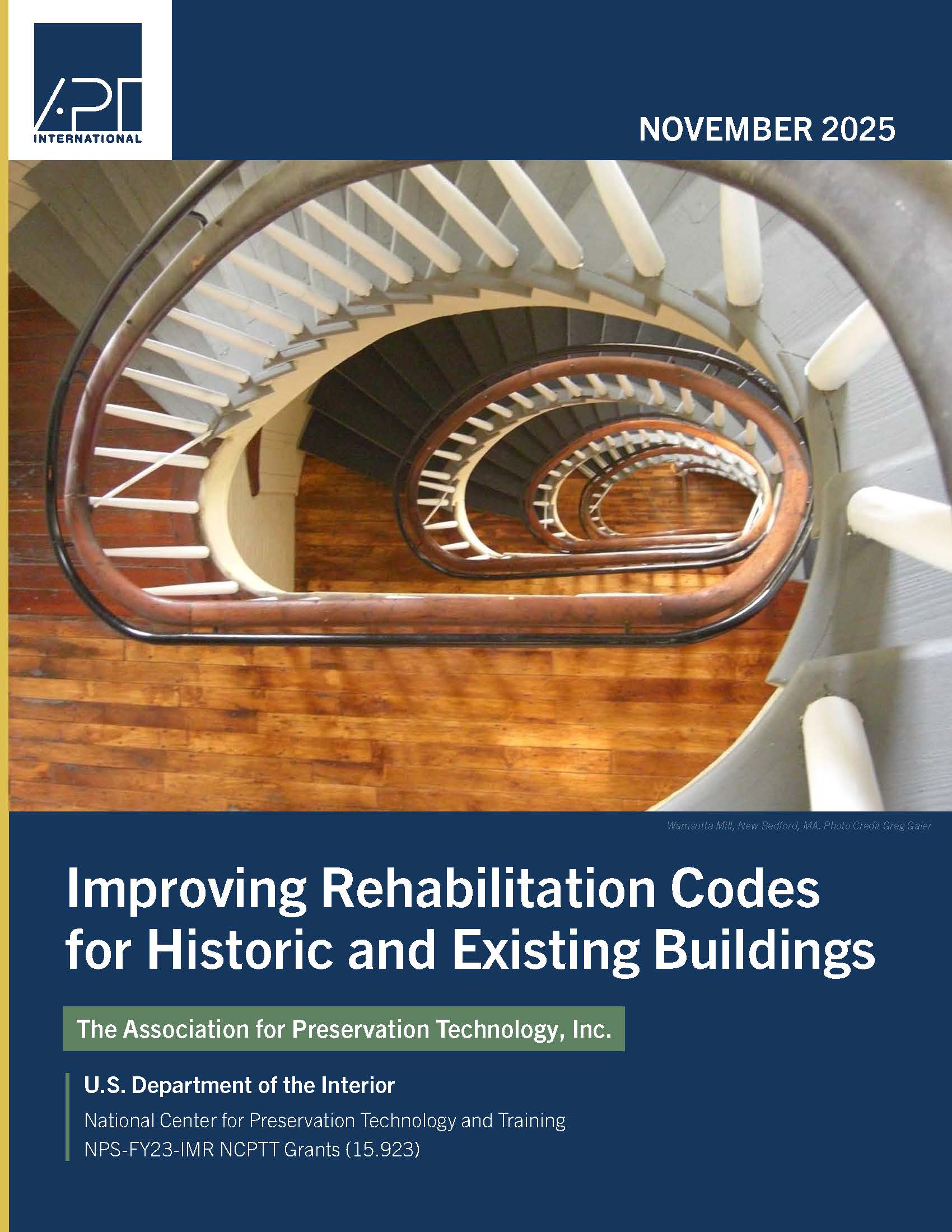 After two years of work and thanks to funding provided by NCPTT (the National Center for Preservation Technology and Training), APT’s Committee on Codes and Standards released “Improving Rehabilitation Codes for Historic and Existing Buildings,” a 110 page digital publication. This document provides detailed information to advance modifications to the model construction codes in the U.S. that can better serve historic and other existing buildings.