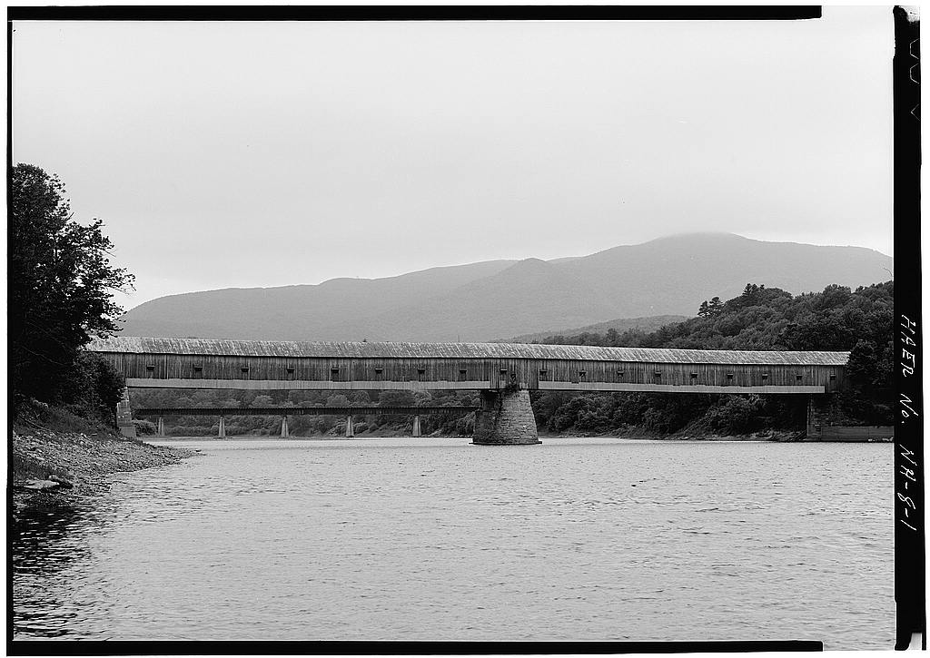 Photo credit: Historic American Engineering Record, Creator, James F Tasker, Bela J Fletcher, Ithiel Town, David C Fishchetti, Chesterfield Associates, Jan Lewandoski, et al., Lowe, Jet, photographer. Cornish-Windsor Covered Bridge, Spanning Connecticut River between Cornish, NH, & Windsor, VT, Cornish City, Sullivan County, NH. Windsor Sullivan County New Hampshire Cornish City Windsor County Vermont, 1968. translateds by Jackson, Donald C.Mitter, and Yearby, Jean P.Mitter Documentation Compiled After. Photograph. https://www.loc.gov/item/nh0177/ and https://www.loc.gov/rr/print/res/114_habs.html.